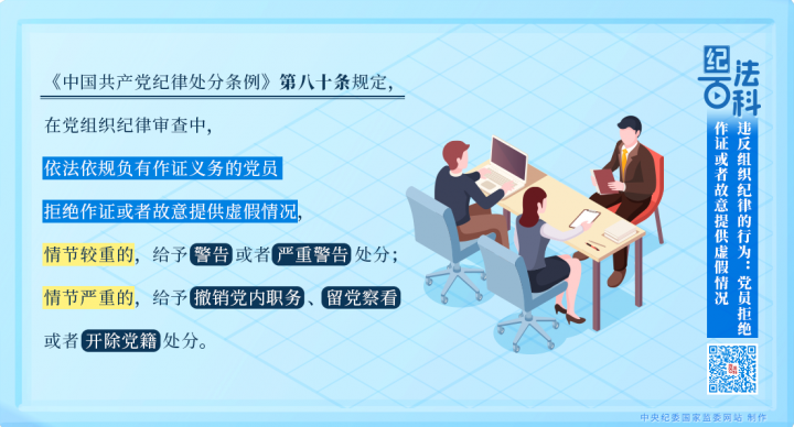 《中国共产党纪律处分条例》第八十条规定,在党组织纪律审查中,依法依规负有作证义务的党员拒绝作证或者故意提供虚假情况,情节较重的,给予警告或者严重警告处分;情节严重的,给予撤销党内职务、留党察看或者开除党籍处分。