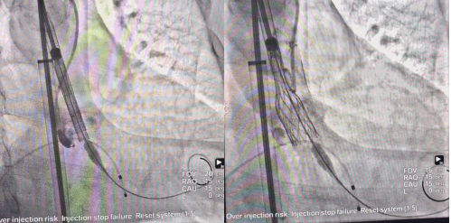 手术在全麻下进行。术中穿刺股动脉建立体表至左心室通路;测量左心室和主动脉压力差超过100mmgH,属极重度瓣膜狭窄,手术指征明确。随后进行进行球囊预扩,初步打开主动脉瓣口,为人工瓣膜输送创造条件。球囊充盈时可见瓣叶钙化挤压球囊,预示钙化亦会对人工瓣膜有充分贴靠。